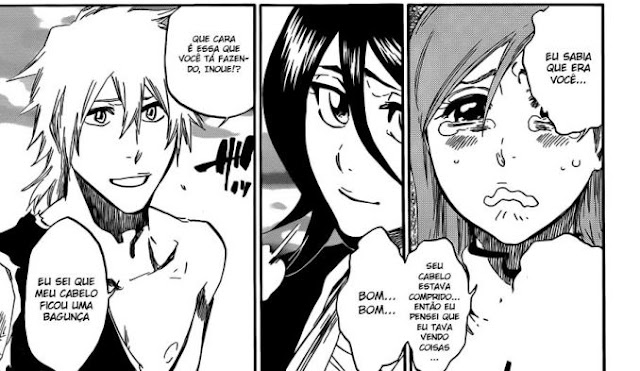 Para mim a situação onde o Ichigo nota que a Orihime trocou de roupa ou quando fala que imaginou que ela pesasse mais do que imaginava (risos) é algo que possui de fato fundamento romântico, diferente das interpretações Ichirukis.
